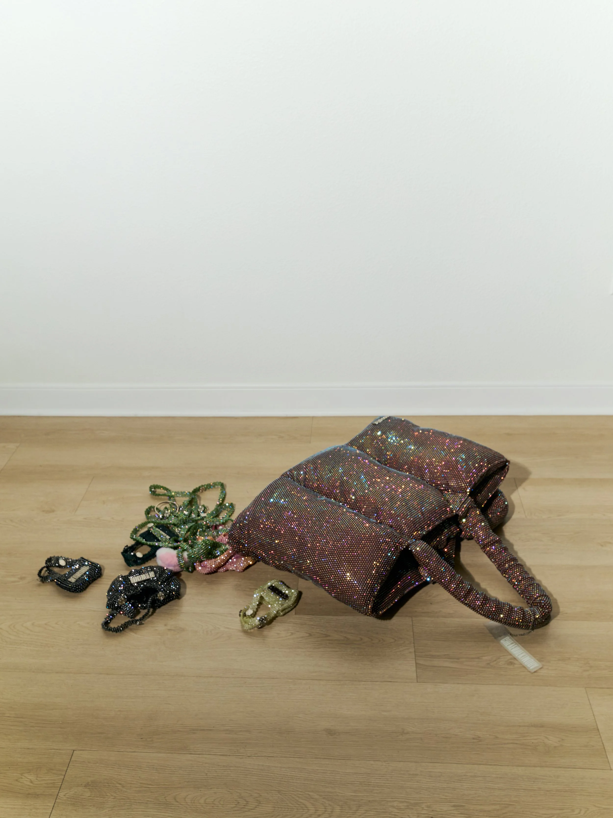 Denim couture is created separately — hand-embellished with individually applied crystals, intended for future gallery presentation. These are not accessories. They are works.