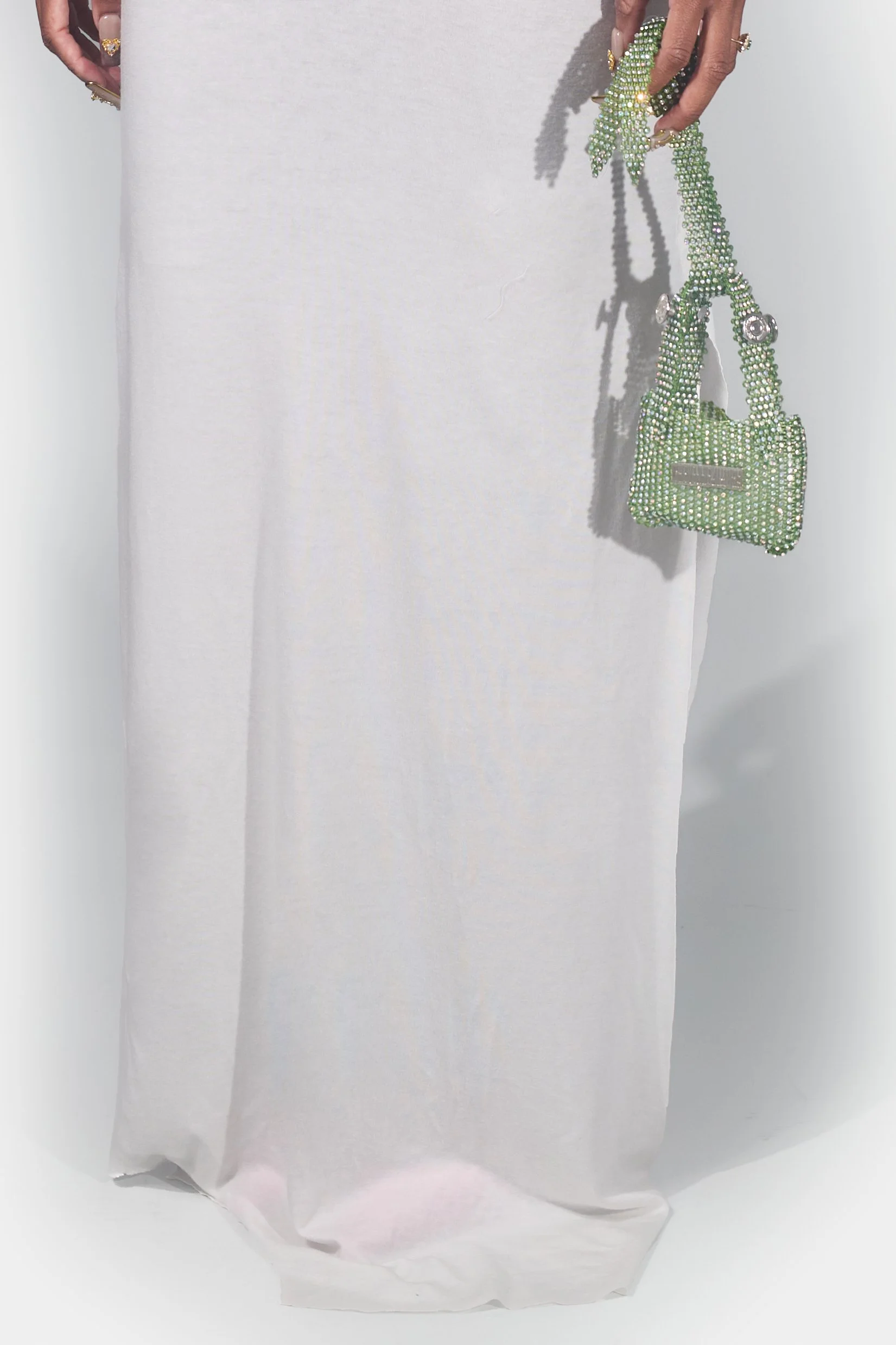 A crystal fabric strap runs through both handles and ties into a fixed knot — creating a 10 inch loop for the wrist. The full piece runs 15 inches from the top of the knot to the bottom of the bag. It dangles. It moves with you. It is less something you carry and more something you wear.